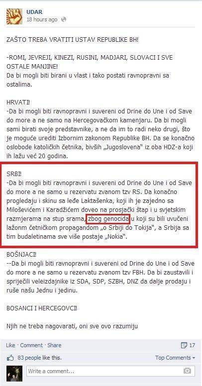 -organizacija ,,Udar", koju RS naziva rezervatom, genocidnom tvorevinom i slično, a osnovni program im je ukidanje Dejtona i unizarizacija BiH(slika dokaz u komentaru).