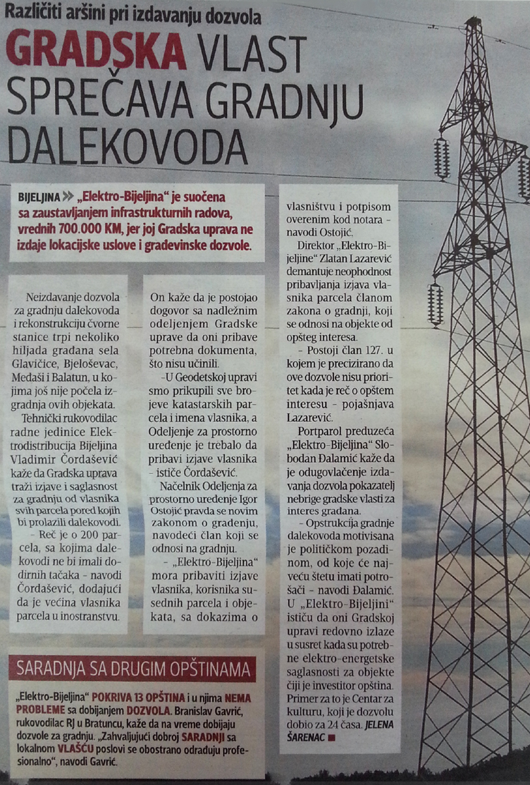 "Elektro-Bijeljina" je suočena sa zaustavljanjem infrastrukturnih radova, vrijednih 700.000 KM, jer joj Gradska uprava ne izdaje lokacijske uslove i građevinske dozvole.