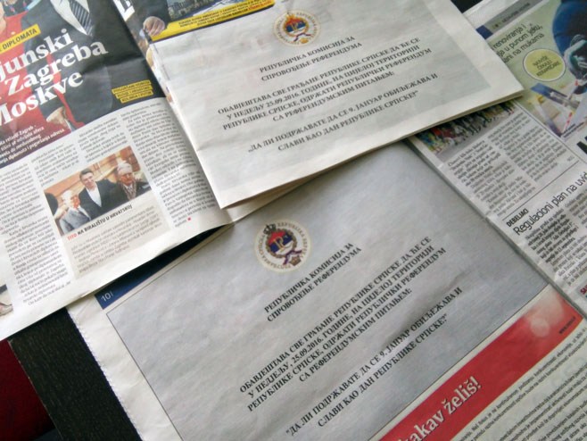 Републичка комисија за спровођење референдума о Дану Републике Српске објавила је данас у дневним новинама у Српској оглас у којима позива све грађане...